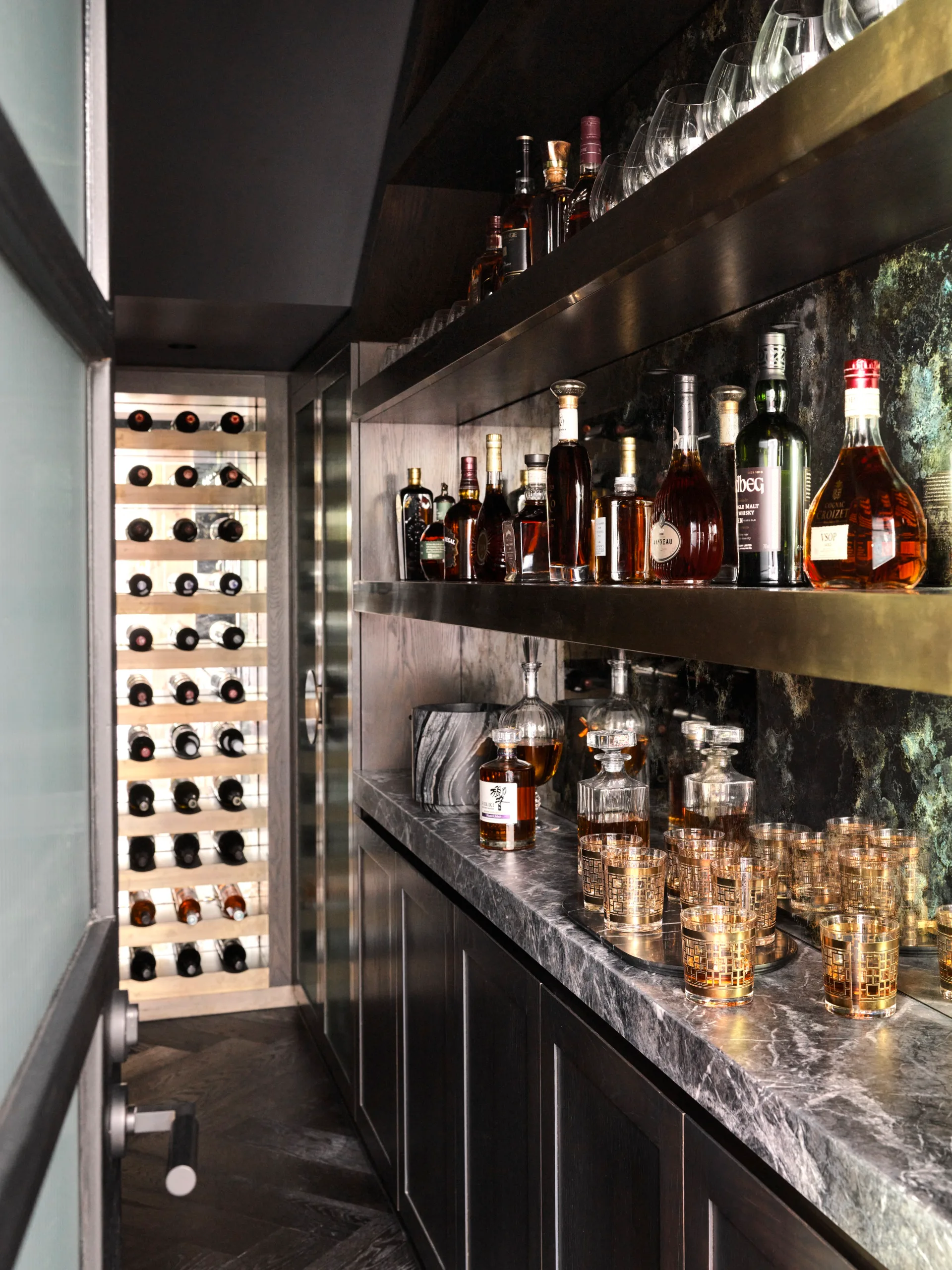 In the wine and bar room, custom joinery in Grigio Carnico marble from RMS Marble & Stone and stained American oak. Waterford Crystal ‘Lismore’ decanter from Amara.