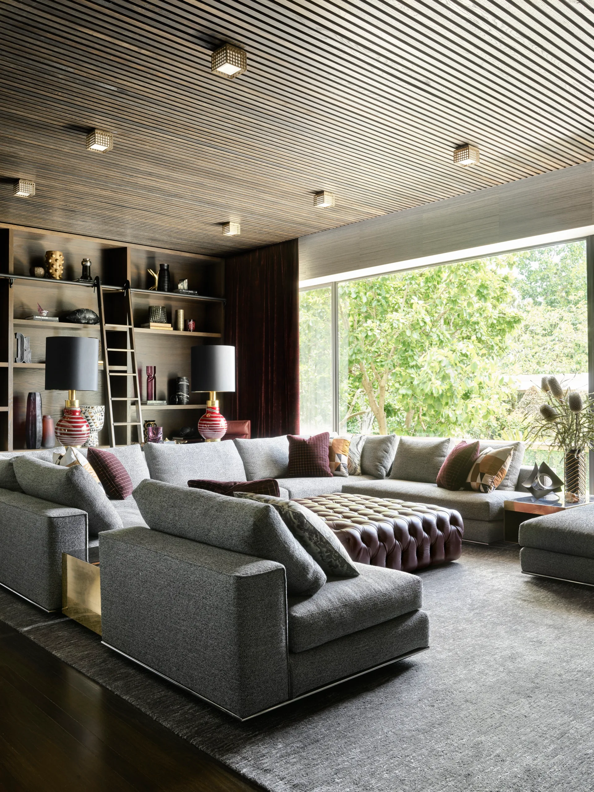 “These finishes create luxe layering and mood.” Similarly, in the family room, he installed a wall of shelving, a fireplace and a slatted timber ceiling to create a cosseting intimacy. In the main bedroom, he installed a fireplace and reoriented the bed so it faced the extensive grounds. “It was a huge room. I played with the proportions.”