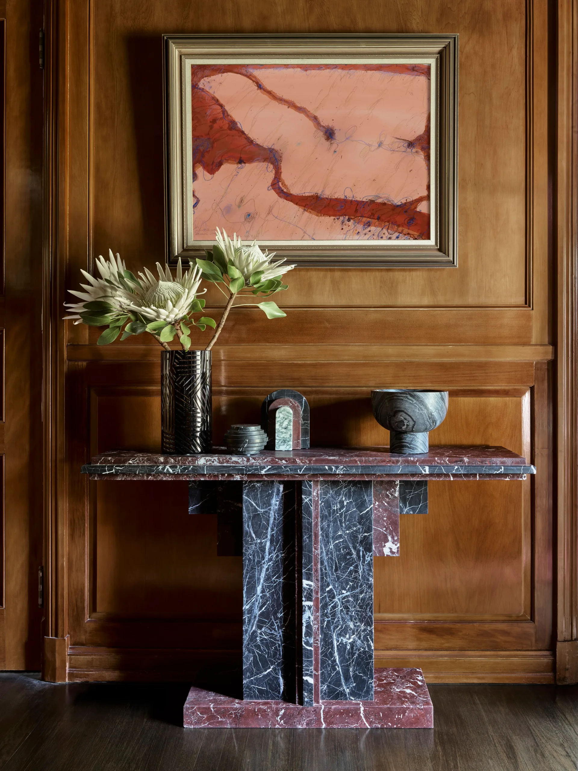 Custom marble console table and ‘Palazzo’ bookends from Greg Natale.