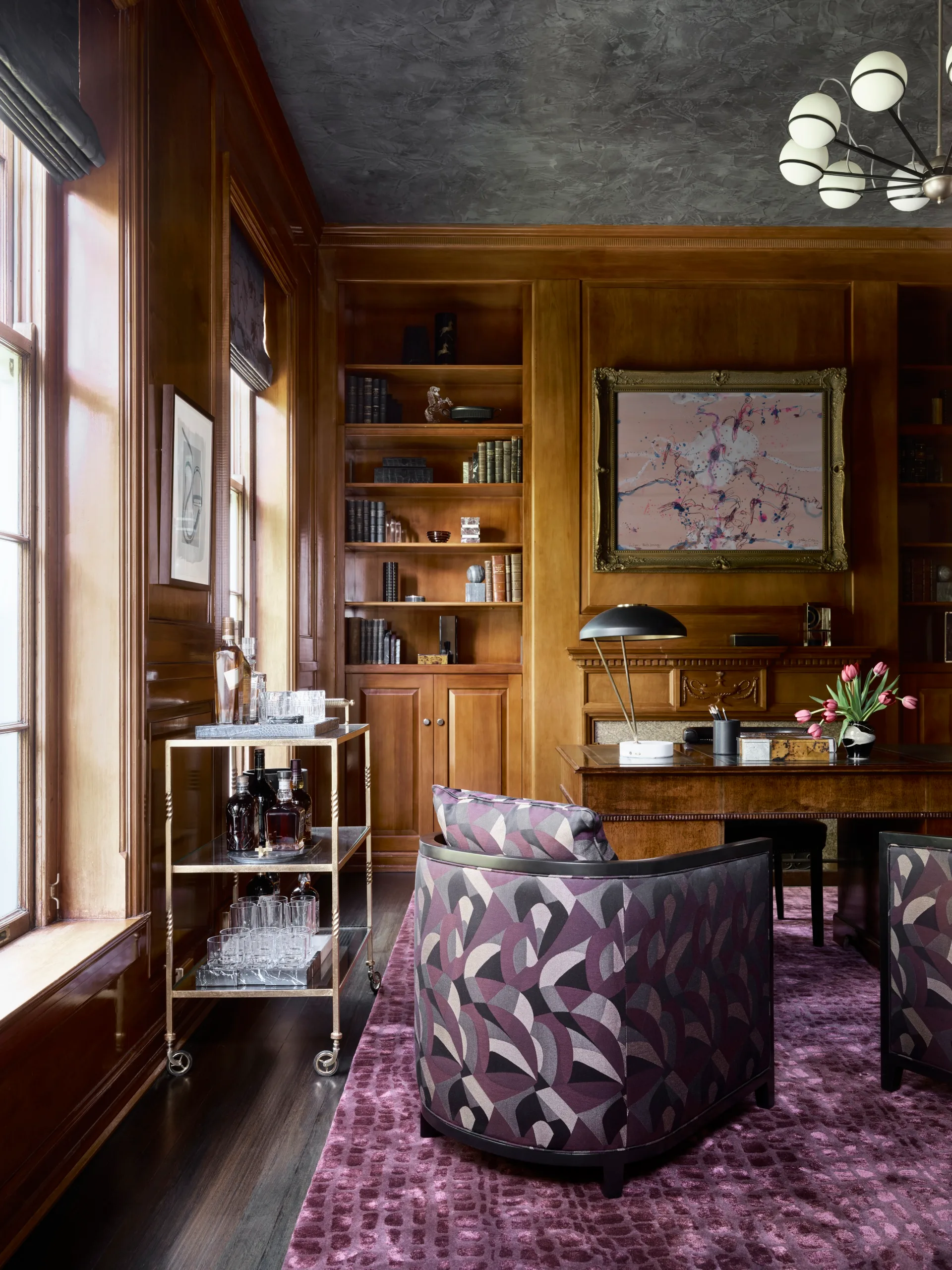 In the office, chair ‘No.693’ and ‘Iceland’ drinks cart from A Rudin. ‘Coquette’ table lamp from Kelly Wearstler. Ceiling light from 1stDibs. Antique desk client’s own. Artwork by John Olsen. ‘Hide’ rug in Burgundy from Greg Natale.