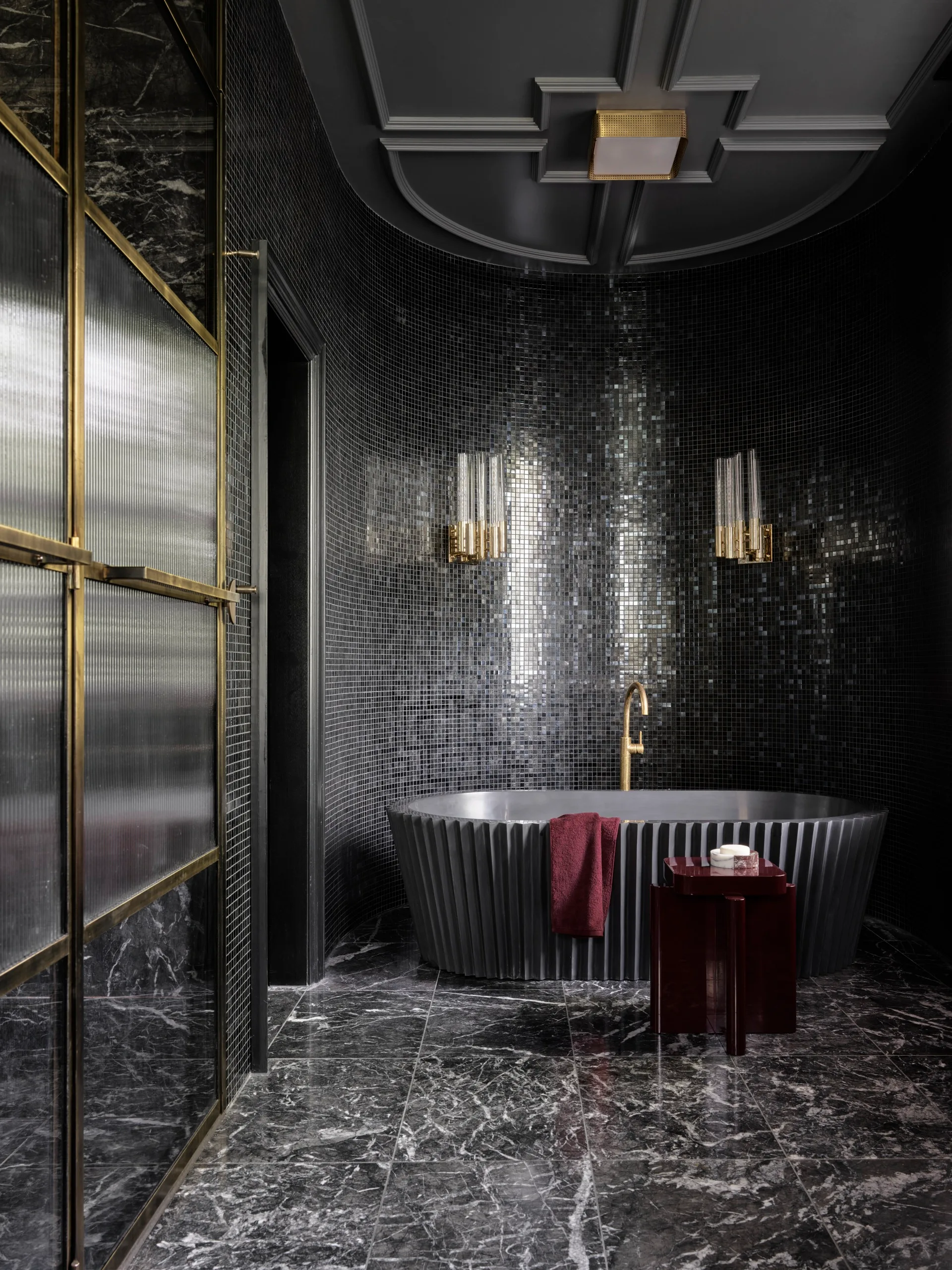 The dark and moody main bedroom ensuite. Grigio Carnico marble on floor from RMS Marble. Greg Natale black mosaics from Bisazza. ‘Origami’ bath from Apaiser. ‘Burj’ wall lamp from Covet House. ‘Precision’ ceiling light from Kelly Wearstler. Burgundy lacquered side table from 1stDibs. ‘Polar’ bowl from Greg Natale.
