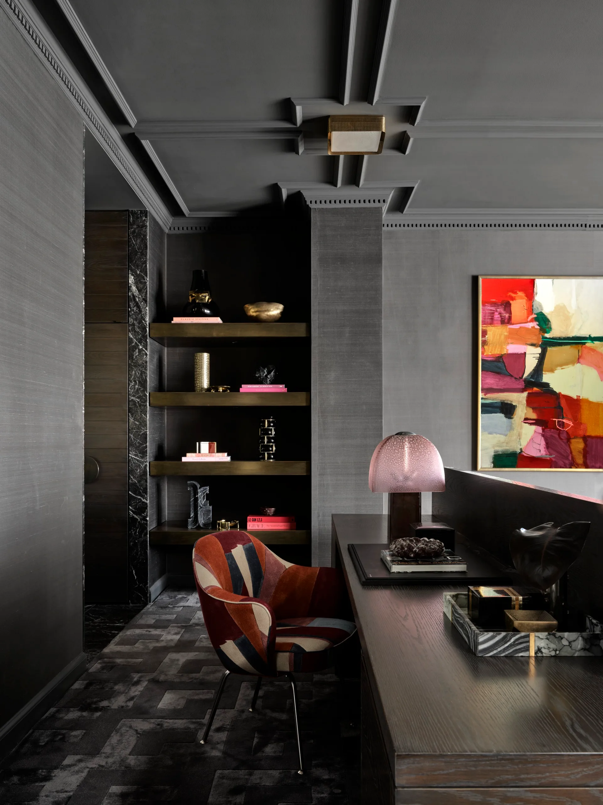 The study area in the main bedroom. Knoll ‘Saarinen’ armchair re-upholstered in ‘District’ fabric from Kelly Wearstler. Vintage table lamp from 1stDibs. On desk, ‘Rope’ bowl, ‘Diane’ marble tray and ‘Nico’ box, all from Greg Natale. On shelves, ‘Mask Bird’ vase and ‘Brick’ vase from Vanessa Mitrani, L’Objet ‘Crocodile’ gold vase from Amara. Artwork by Waldemar Kolbusz.