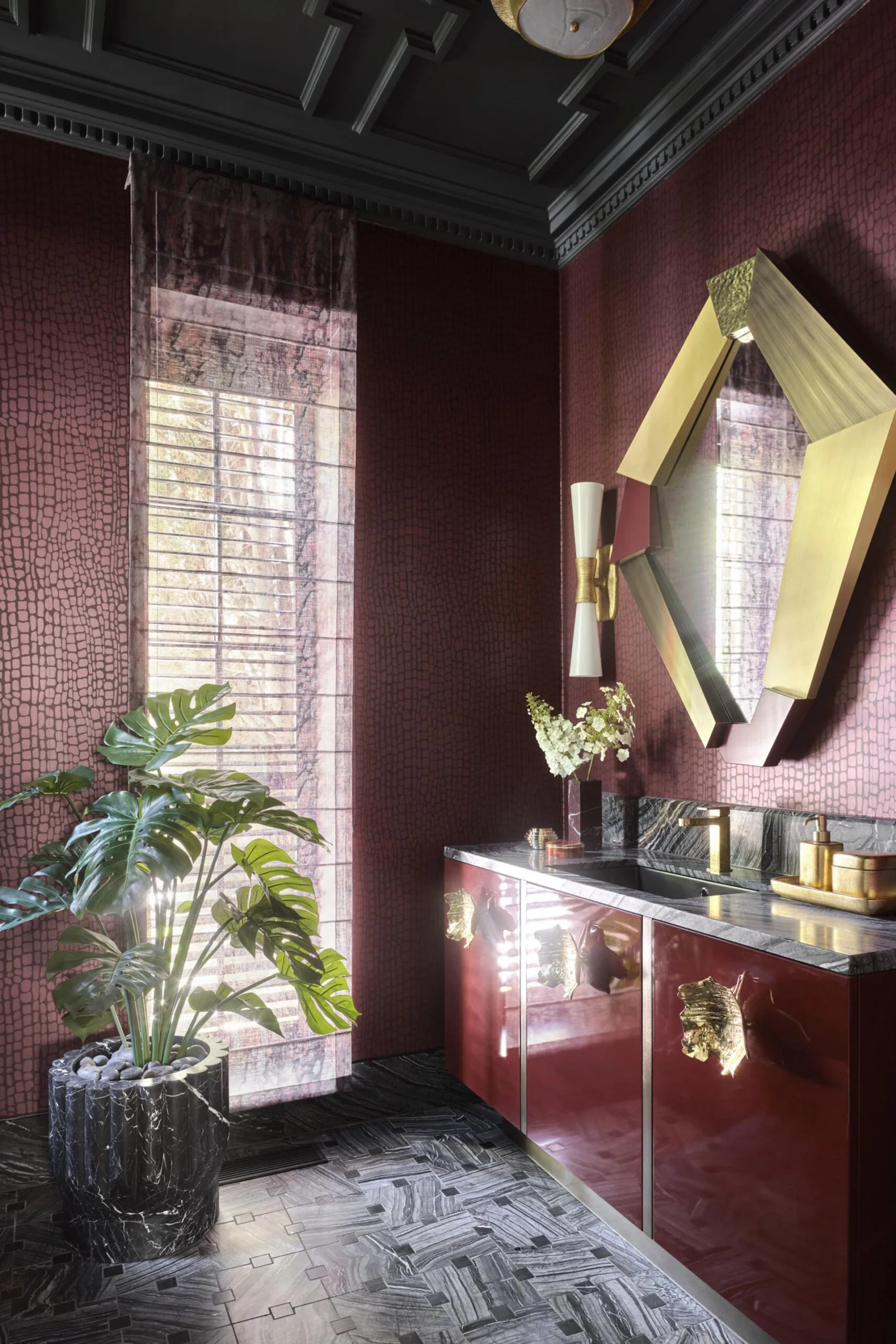 Custom lacquered vanity with brass accents, ‘Appia’ wallpaper in Burgundy, ‘Ziggurat’ and ‘Soleil’ boxes, ‘Mies’ and ‘Setllo’ vases, all from Greg Natale. ‘Utopia’ wall light from Kelly Wearstler. ‘Ava Gold’ accessories from Labrazel.