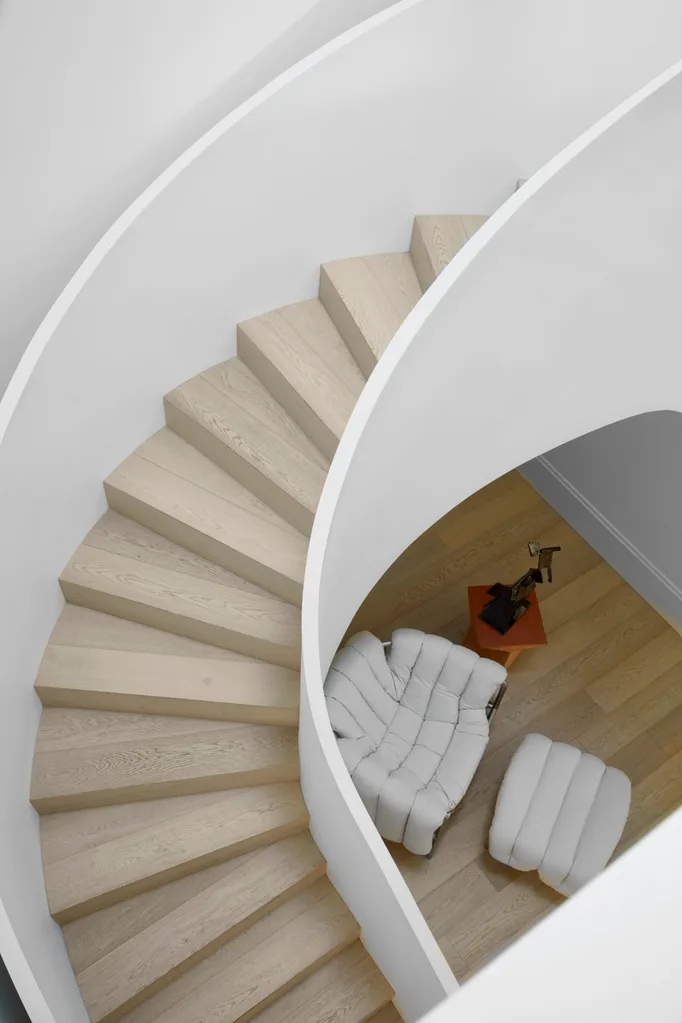 Classic Crittall doors with steel mullions open to a reception area. From there, curved walls offer glimpses of adjoining areas, washes of light guiding you through the spaces, culminating in a sweeping staircase luring you up to the main living areas. A skylight above drenches the core of the house with daylight.