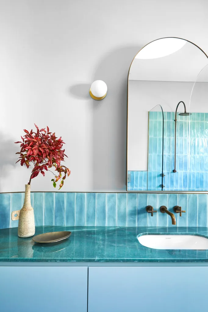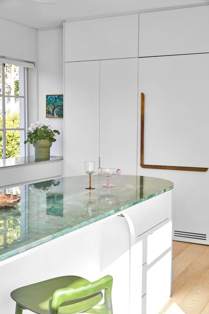 Pared-back finishes include white walls to emphasise those glorious curves, reflect the light and provide a neutral backdrop for the owners’ art collection, while oak flooring in the living areas is a warming counterpoint. “My clients were keen to explore finishes and play with colour, for the bathroom joinery in particular,” says Imogene. “Soft greens and blue tiling throughout took their cues from the original bathroom tiles.” Brass trims and hardware contrast with new green stone benchtops and coloured cabinetry, while a vast Valley modular sofa from Jardan sums up the furniture selection. It again uses the odd curve or two, and the owner chose most of it herself.