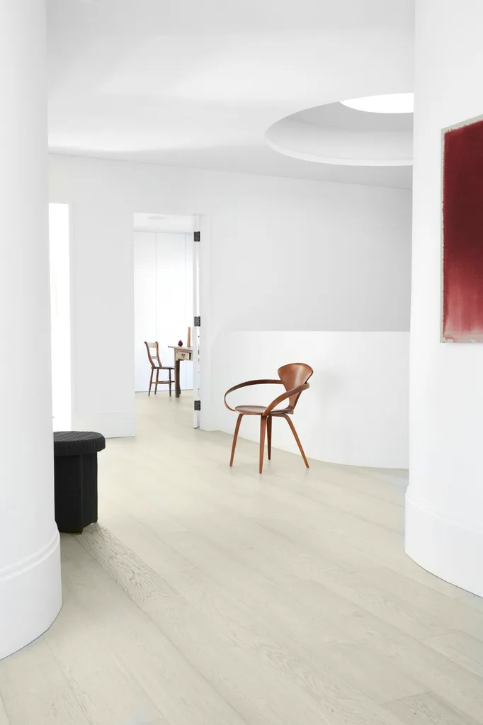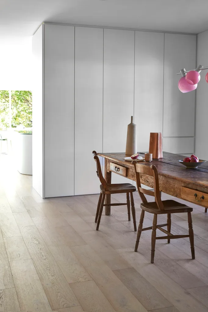 DINING A vintage table and chairs sit well with the flooring in Limed Sandstone from Aged Oak Floors. Joinery, Dulux Natural White. Mae pendant, Jardan. Wooden bottle, Space. Skáfos vase, Artedomus. Plate, Robert Gordon.
