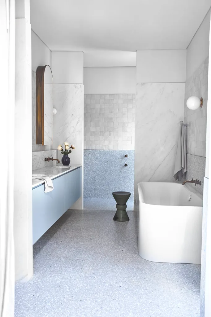 BATHROOM Terrazzo alludes to the home’s Art Deco origins and adds extra visual interest. Vanity with Carrara top from Artedomus; cupboard doors in Porter’s Paints Newport Blue. Maxim ‘Calacatta’ marble wall slabs, also Artedomus. Fibonacci ‘Flannel Flower’ wall and floor tiles, and Zellij white wall tiles, Skheme. Happy D2 bath by Duravit. Icon tapware in Aged Brass, Astra Walker. Mezzo light, Spence & Lyda. Crown stool, Robert Plumb. Towels, Polite Society.