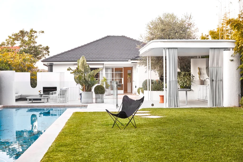 GARDEN Beside the pool, a large stretch of lawn gets plenty of use. When it’s cold, the area in front of the Escea EW5000 fireplace is where everyone wants to be. Swisspearl grey concrete-like ‘Sushi Pot’ planters from Robert Plumb. Butterfly chair with black canvas cover, Angelucci 20th Century.