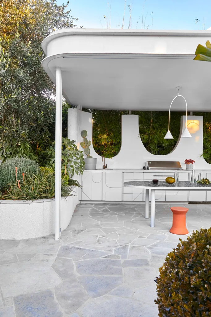 OUTDOOR LIVING AREA The new canopy over crazy paving provides much-needed shade and a home for the outdoor kitchen. Cut-outs in the wall and the detail on the cupboard doors echo the interior’s curves. Tiled dining table, made to order. Terracotta stool, Robert Plumb.