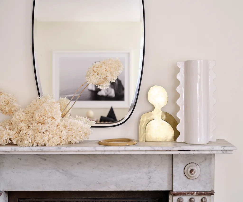 Mirrors from Life Interiors adorn several walls in the apartment, and here one of the mirrors gives a decorative display extra dimension. On the mantle is a beautiful golden sculpture by The Visuals, a Softedge Studio plate and a Sarah Ellison vase.