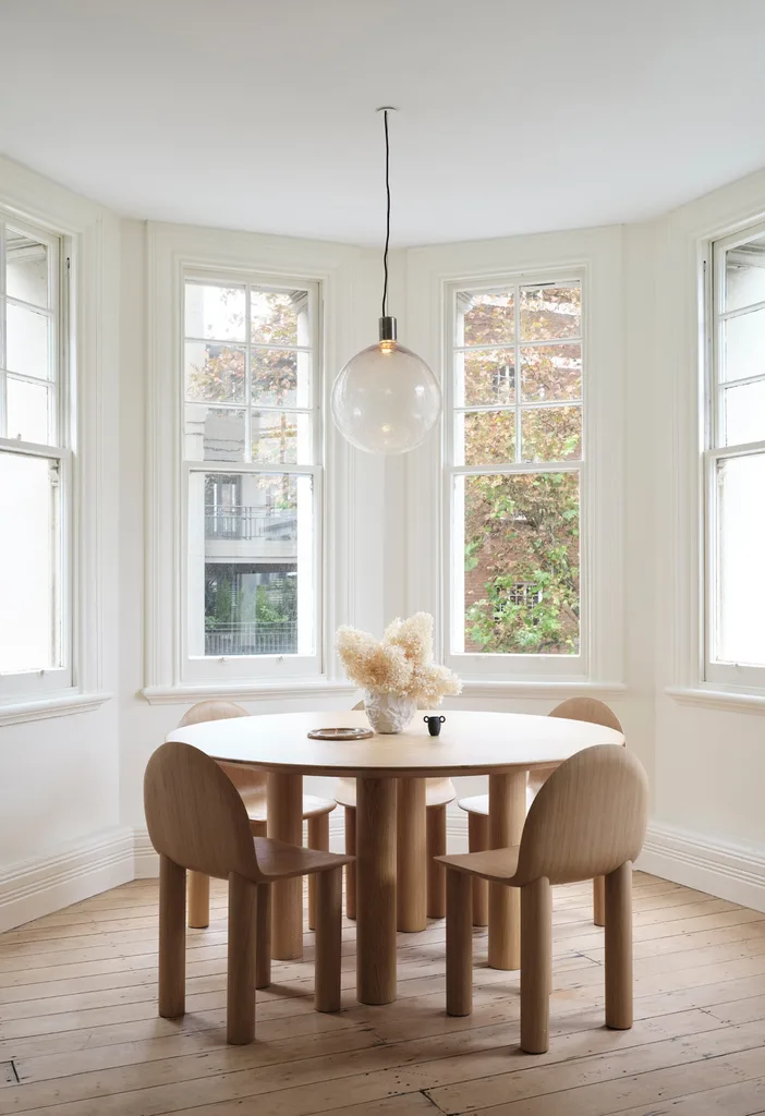 Sarah’s Earth dining table and Arch chairs beautifully sit within the curved contours of the Art Deco apartment. The pendant is by ADesign. Rather than mixing colours, Sarah layers different tonal textures and materials. Chrissi adds, “I love the depth of thought placed into each of her designs. The furniture has visual definition.”