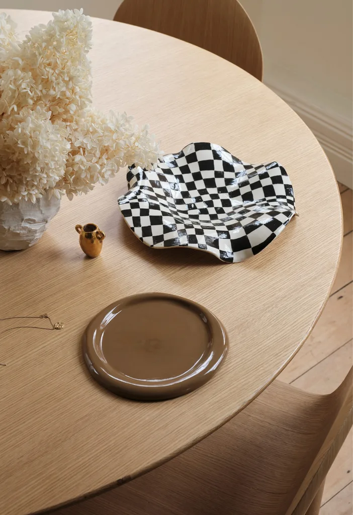 Situated in Potts Point, a postcode populated by exceptional eateries and Art Deco architecture, are the Three Rooms Sydney apartments curated by Cult Design, MCM House, and most recently, designer Sarah Ellison. The newly-designed space’s living area is furnished with Sarah’s own pieces including the Muse sofa, Alva lounge chairs and Chub coffee table, and she accessorised the apartment with Armadillo rugs and Softedge Studio ceramics, such as the black and white dish.