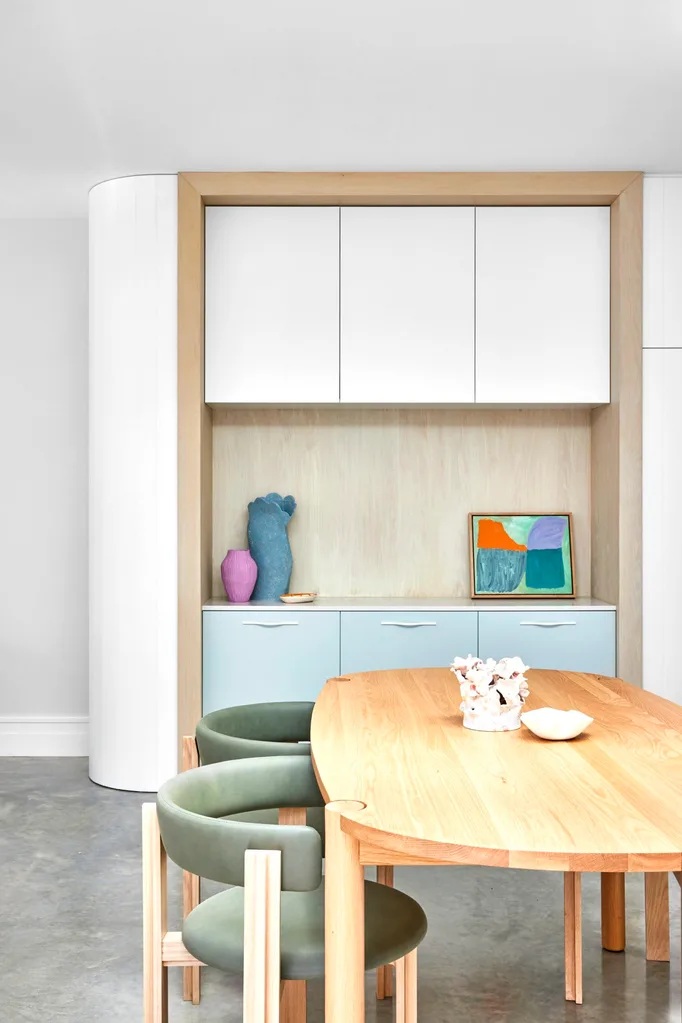 DINING AREA The servery has the same finishes as the kitchen. Cove oak dining table, Trit House. Chairs, Cult Design. Wave bowl, McMullin & co. Side plate, Alex and Trahanas. Pink vase by Bianca Pintan, Rainbow Studios. Blue vase by Bettina Willner, Saint Cloche. Painting by Liam Power, Michael Reid Northern Beaches.