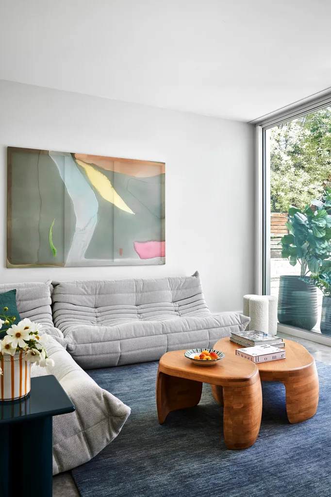 LIVING AREA “This room is designed to be very simple and utilise all the available space,” says Amanda. Togo sofa upholstered with Dios fabric in Ecru, Bold side table in Lacquer Ocean Blue, and console in Lacquer Glossy White, all from Domo. Solstice oak tables, GlobeWest. Large artwork by Loralee Jade from Hake.