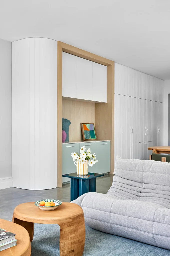 CABINETRY Masiku Kitchens did all the joinery, including the tall units in Dulux White On White. Brave handles, Linear Standard. Flooring, polished concrete. Bobby bar stools, DesignByThem. Scallop platter in Electric Blue, Maison Balzac. White vase, H&M.