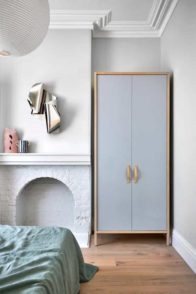 BEDROOM Hay ‘Rice Paper’ shade, Cult Design. Wine cooler, Alex and Trahanas. Sculpture by Bettina Willner, Saint Cloche. Wall sculpture above fireplace by The Visuals.