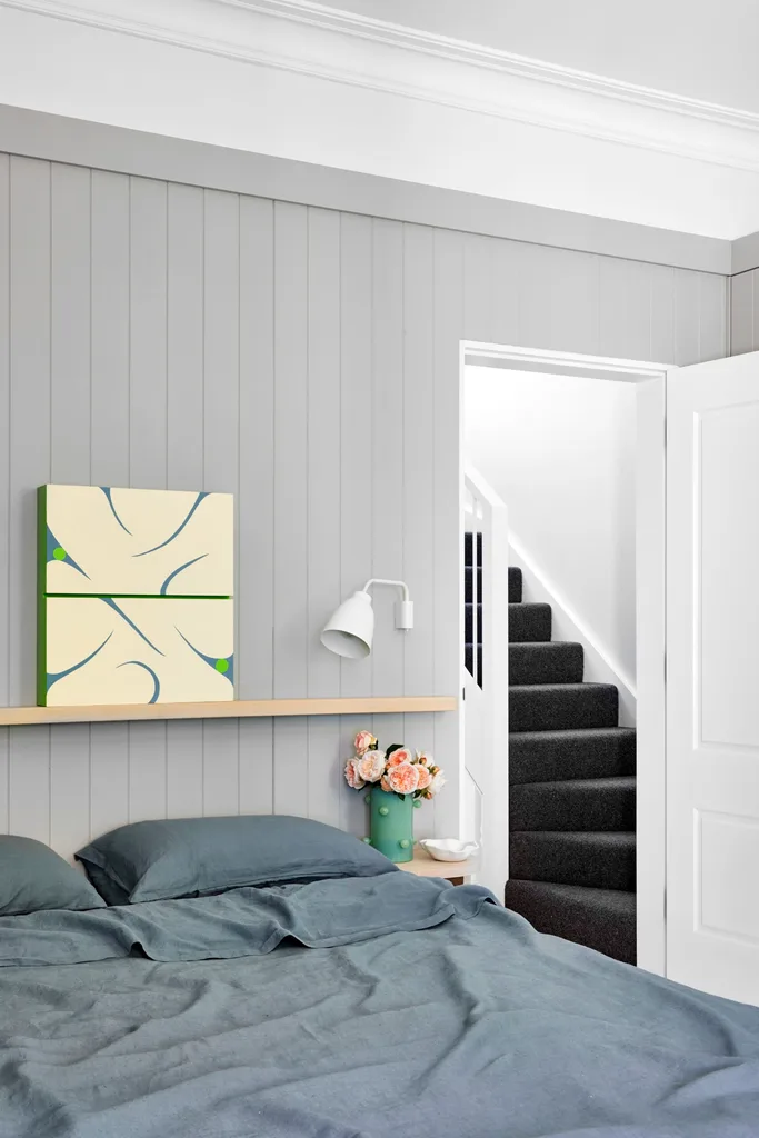 BEDROOM “I designed the warm timber headboard shelf and bespoke bedside tables for this space,” says Amanda. Linen, Cultiver. Caravaggio ‘Read Wall’ light, Cult Design. Pomponette vase, Maison Balzac. Walls, Dulux Milton Moon and White On White. Artwork by Evi O, through Saint Cloche.