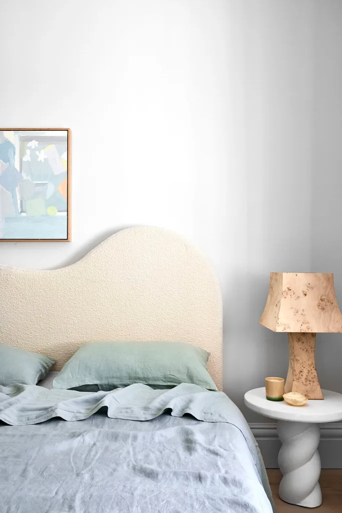 BEDROOM Amanda chose a curved bouclé bedhead by McMullin & co, and designed freestanding wardrobes to harmonise with the fireplace. Linen, Cultiver. Burlie lamp on Twister side table, both by Sophie Davies. Candle, Marloe Marloe. White box, Dinosaur Designs. Artwork by Pia Murphy, through Michael Reid Northern Beaches.