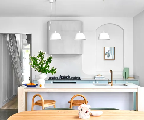 KITCHEN “I wanted the floating island to feel like another piece of furniture,” says designer Amanda Barnett. The original home had an arched window and she incorporated the idea into the new extension. Silestone suede-finish Nolita benchtops by Cosentino, with base in oak veneer and polyurethane in Dulux Tranquil Retreat. Rear joinery in Dulux Roland. Maris sink, Franke. City Stik mixer by Brodware. Ambit lights, Living Edge. Walls, Dulux Vintage Linen. Rangehood, Bauwerk limewash in North. Artwork by Phoebe Stone, through Hake. Sage Arc vase, Rainbow Studios. Yellow plate, Alex and Trahanas.