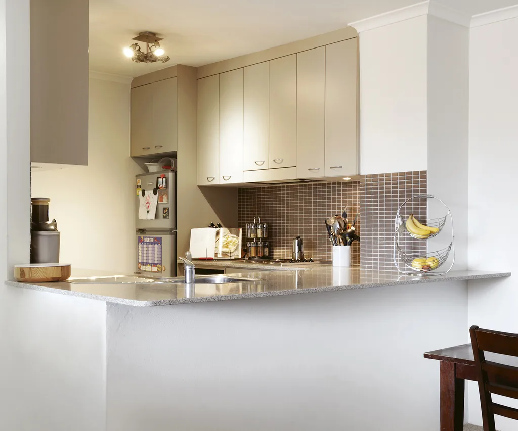 Michelle is keen to rearrange the layout, but Stuart doesn’t seem as enthusiastic. It’s not worth spending all the budget pursuing the ideal kitchen when this one is functional. I’d fix a few hinges and change the colour of the cupboards – white up top and grey below. Get a professional to repaint the cabinetry with a water-based enamel and they’ll be good as new. Choose timber or black handles, and tile over the splashback with a white subway tile. The benchtops are fine. There is room for an extra cupboard in the awkward corner by creating access from the hall or dining area.
