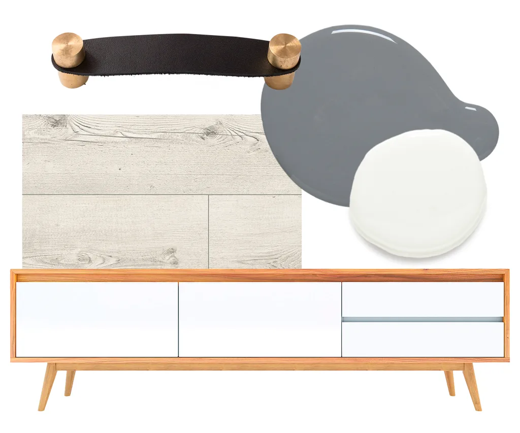 Inspiration (clockwise from top left) ‘The Cassadie’ handle, from $40, The Design Hunter. ‘Clean & Protect’ low sheen interior paint in Systematic, $62.50/4L, British Paints. ‘Wash&Wear’ low sheen interior paint in Vivid White, $74.90/4L, Dulux. Modish ‘Pin’ entertainment unit, $1059, Zanui. 12mm laminate flooring in Whitewashed Oak, from $55/sqm, Formica.
