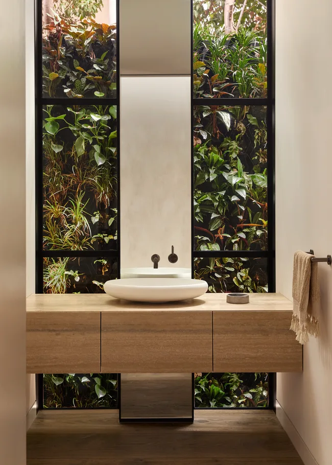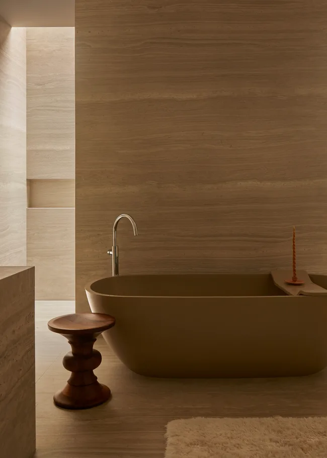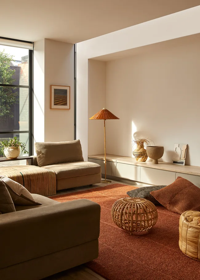 Through considered material choices, the modern and pared-back space was given grounding and warmth. In the living room, a burnt orange sisal rug was layered with floor cushions made by indigenous Colombian artisans using vegetable dyes, wicker lamps and locally-made ceramics. Elsewhere in the house, vein cut travertine forms a backdrop from which complimentary neutrals were derived.