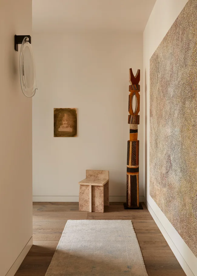 A small Jeffrey Smart painting of warm-toned bricks was at the centre of interior designer Brahman Perera’s inspiration for the redesign of this family home in Melbourne. The brief was to find an authentic and integrated way to marry the contemporary architecture with the client’s beloved pieces of furniture and most treasured collections.