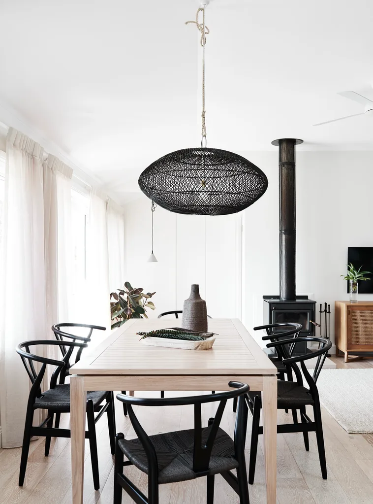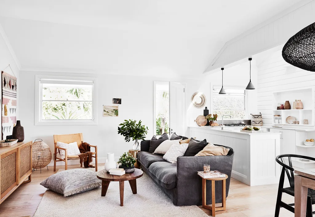 The open-plan living, dining and kitchen area has a crisp white backdrop and neutral and black furnishings. The sofa is from Uniqwa.