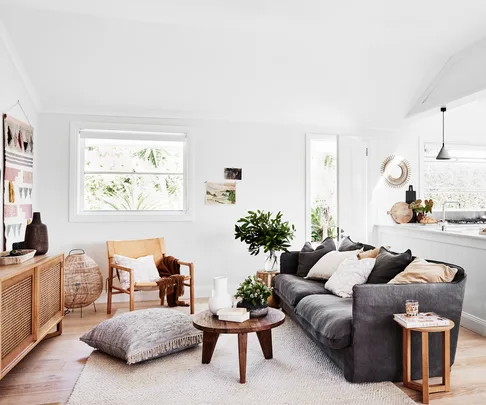 The open-plan living, dining and kitchen area has a crisp white backdrop and neutral and black furnishings. The sofa is from Uniqwa.
