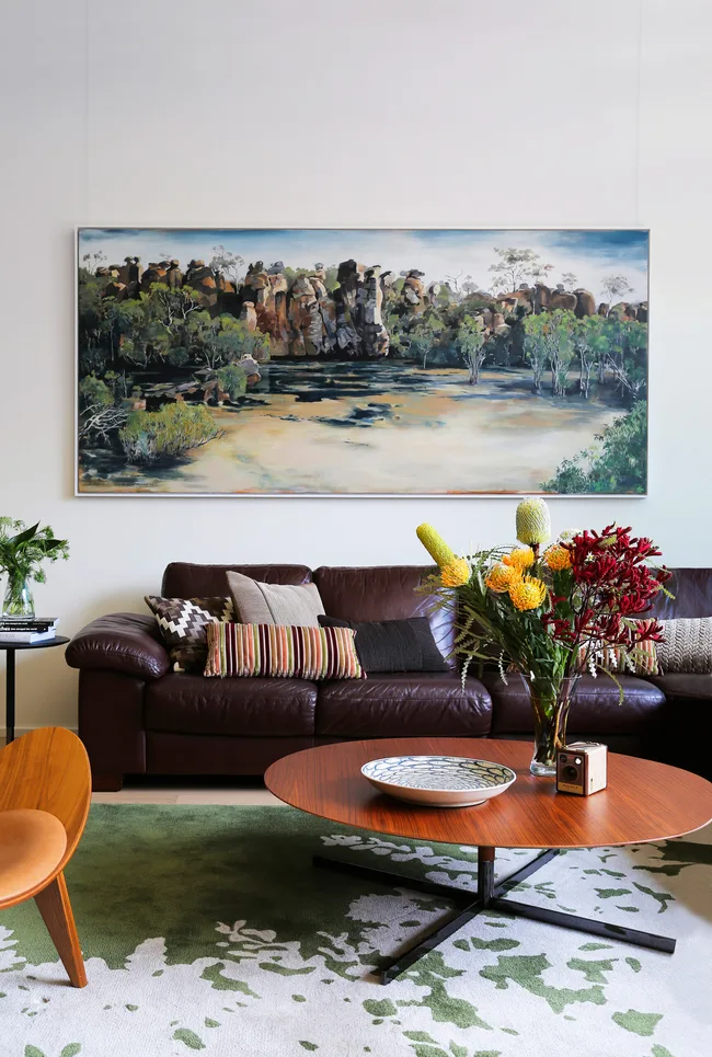 Karen and John asked artist Angela Hayson to create a huge artwork for the living room and now Guardians of the Waterhole NT, seen here, is a defining feature of this room.