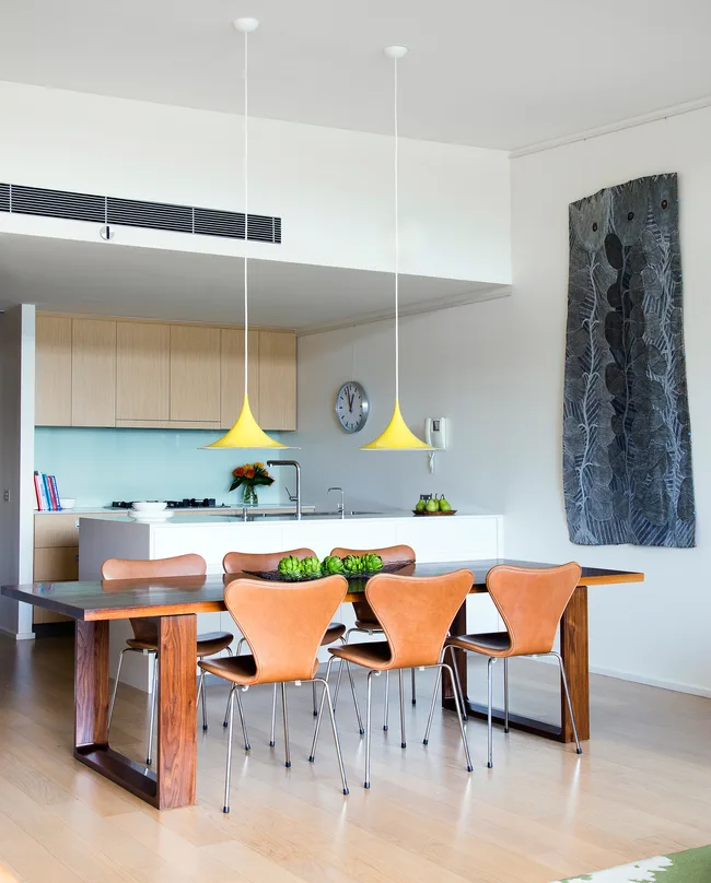 Like most walls in the home, the space next to the dining table required a large-scale artwork, in this case a bark painting by Malaluba Gumana.