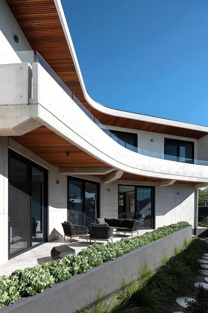 The facade is all contemporary angles realised in hardwearing materials. Timber-look aluminium cladding from Covet. Pots, The Balcony Garden.