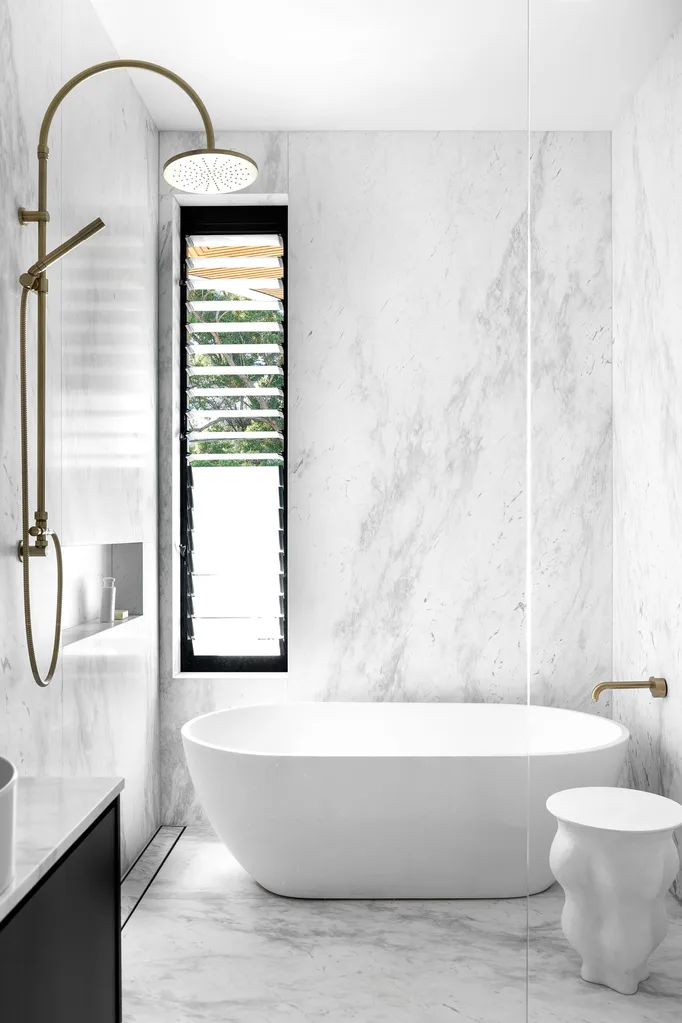 Freestanding bath, Stone Baths. Hermes Vangeli marble from Euro Natural Stone. Halo tapware and Yokato shower set, both Brodware.