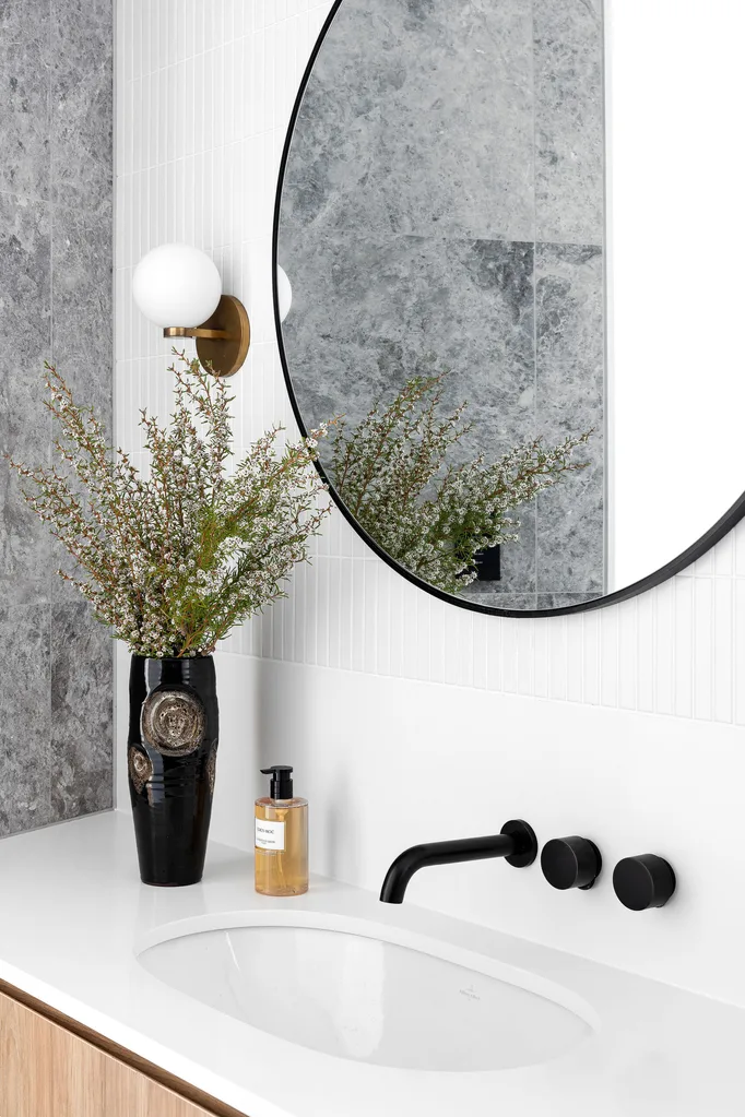 Kit Kat mosaic tiles, Surface Gallery. Mirror, West Elm. Halo basin set, Brodware. Code Zero wall light, Nightworks Studios. Tundra Grey marble, Euro Natural Stone. Quantum Quartz Ultra White benchtop.