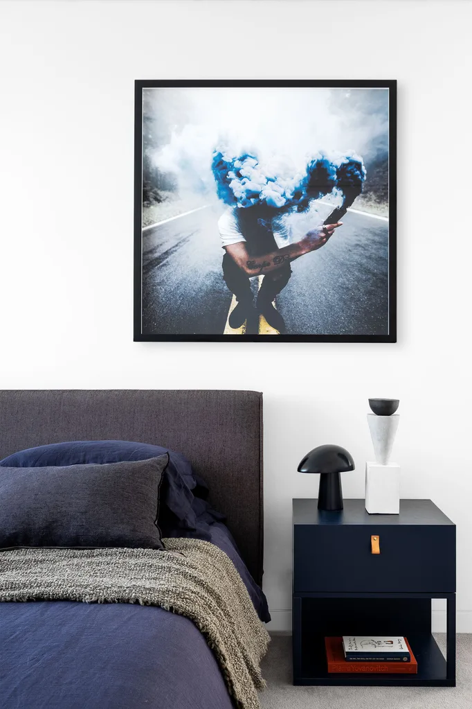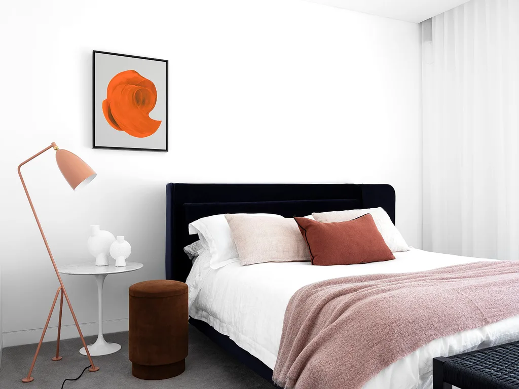 Arlington bed, Bo Concept. Leo bedside table, Grazia & Co. Night Owl lamp, Cult Design. Sculpture by Humble Matter, Curatorial+Co. Carpe Diem artwork by Brian Crippe.