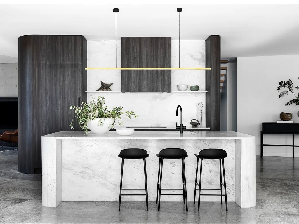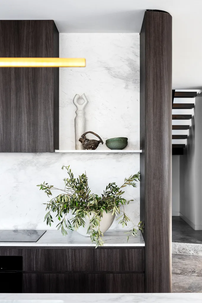 Cabinetry in the kitchen is Navurban veneer in Ravenswood, New Age Veneers. Island and splashback finished in Hermes Vangeli marble from Euro Natural Stone.