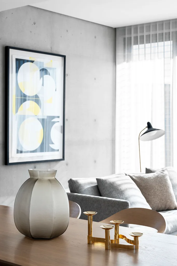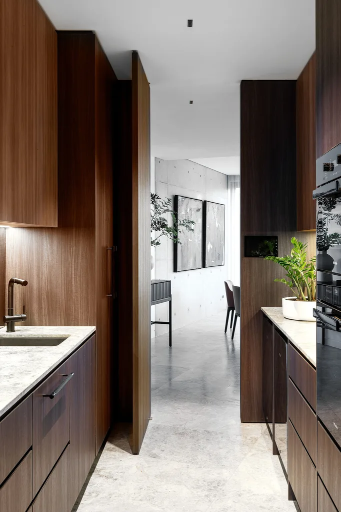 Off-form concrete walls, Tundra Grey limestone floors and tactile marble and timber finishes predominate, providing a luxe base palette that is timeless and organic.