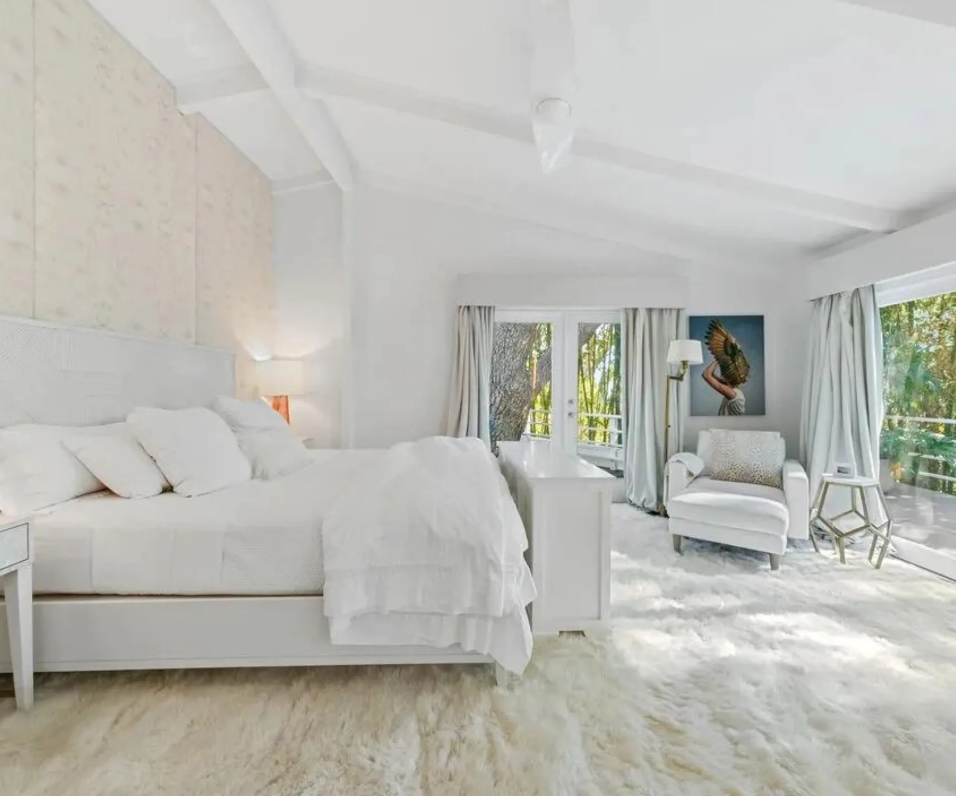 The main bedroom of Miranda’s Malibu home features luxe shag rugs and sliding doors that open to a private deck.