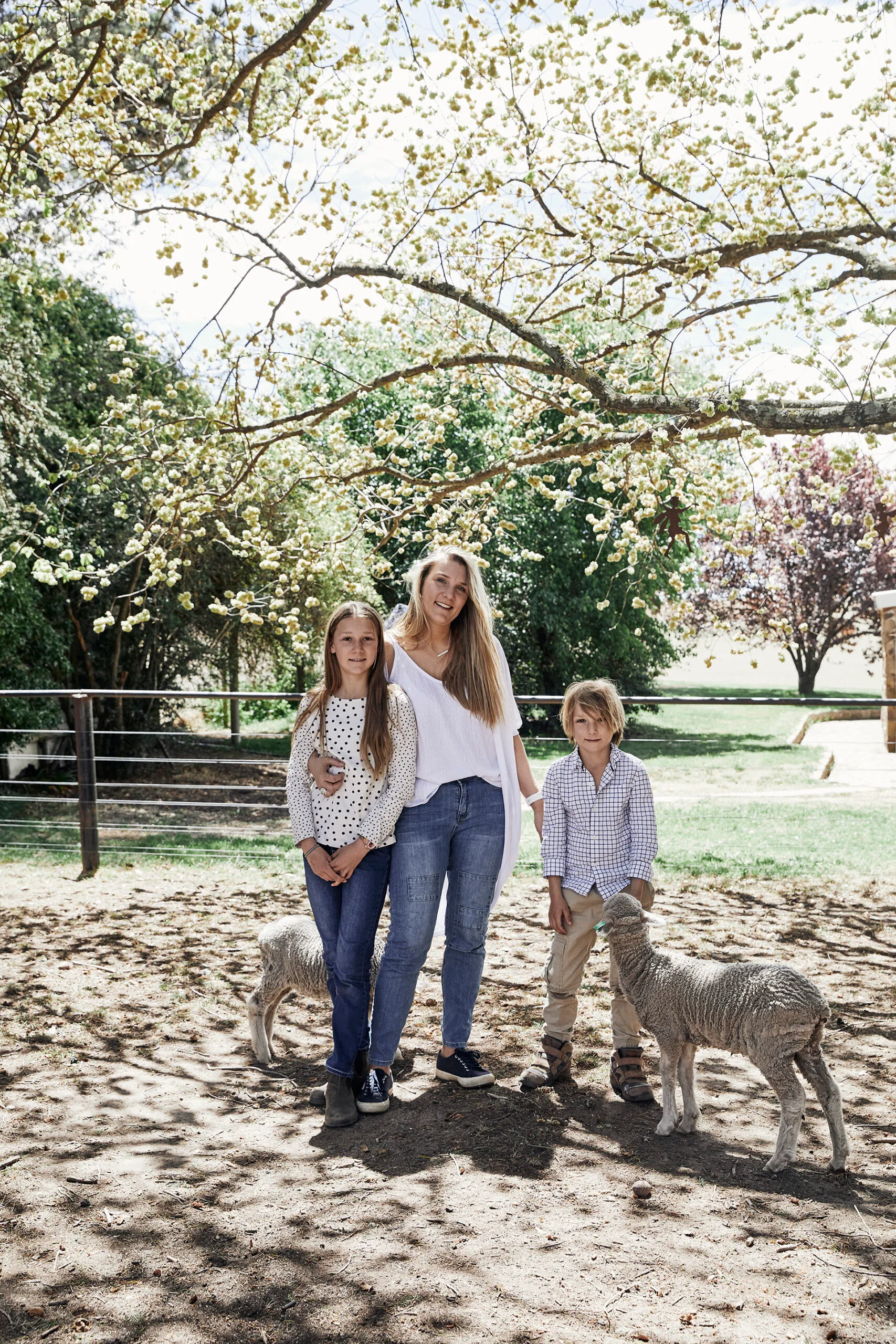Jane with Penelope and Arthur in the home paddock with their lambs.