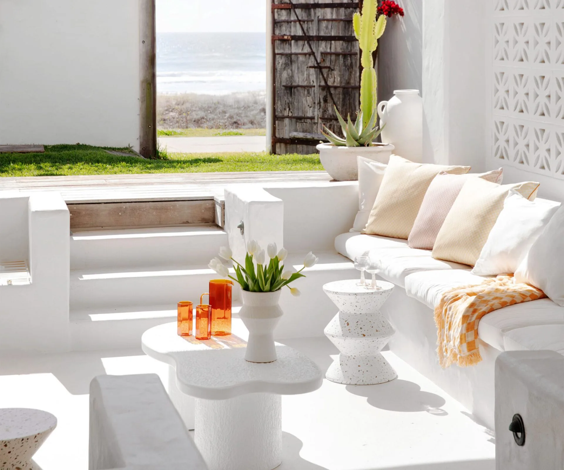 Owned by world champion surfer Mick Fanning, Rolling Seas embodies its coastal context, situated on the brink of Bilinga beach. The retreat, designed by Australian interior icons Three Birds Renovations, is truly one-of-a-kind, with both the main three-storey home and adjacent two-storey cottage collectively hosting up to 12 guests. Its gorgeous palette of tangerines, bronzes and coastal neutrals sweeps you straight into paradise.
