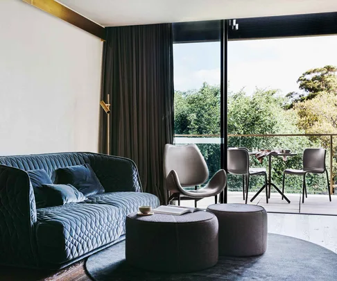 Two-bedroom Garden Suites have their own living space, complete with Grant Featherston chairs.