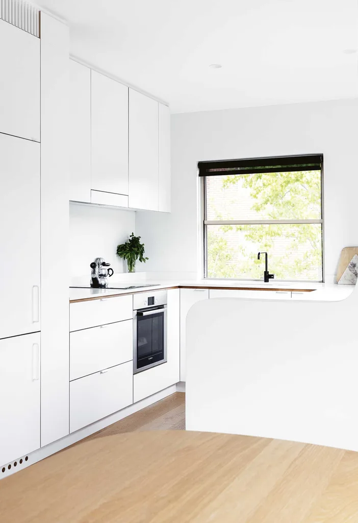 Kitchen The petite kitchen has been kitted out with plenty of drawers that keep everything close at hand, without the need to bend too much. Storage up high is reserved for more occasional items. The benchtop extends into an appliance and breakfast nook, which keeps the kitchen clutter free.