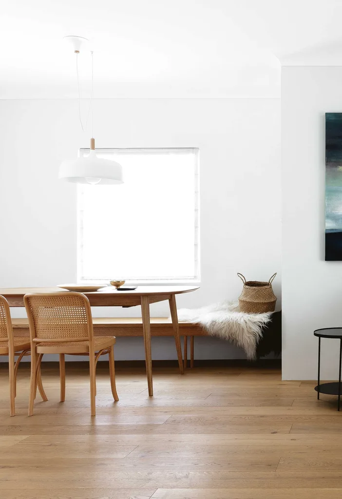 Open-plan living Clean lines and cool whites make for an airy and inviting living area, as well as a streamlined dining zone. In the dining nook, a Northern Lighting ‘Acorn’ pendant light hangs above an Orson & Blake dining table with a custom-made bench seat by Joseph McCombie and Thonet chairs.