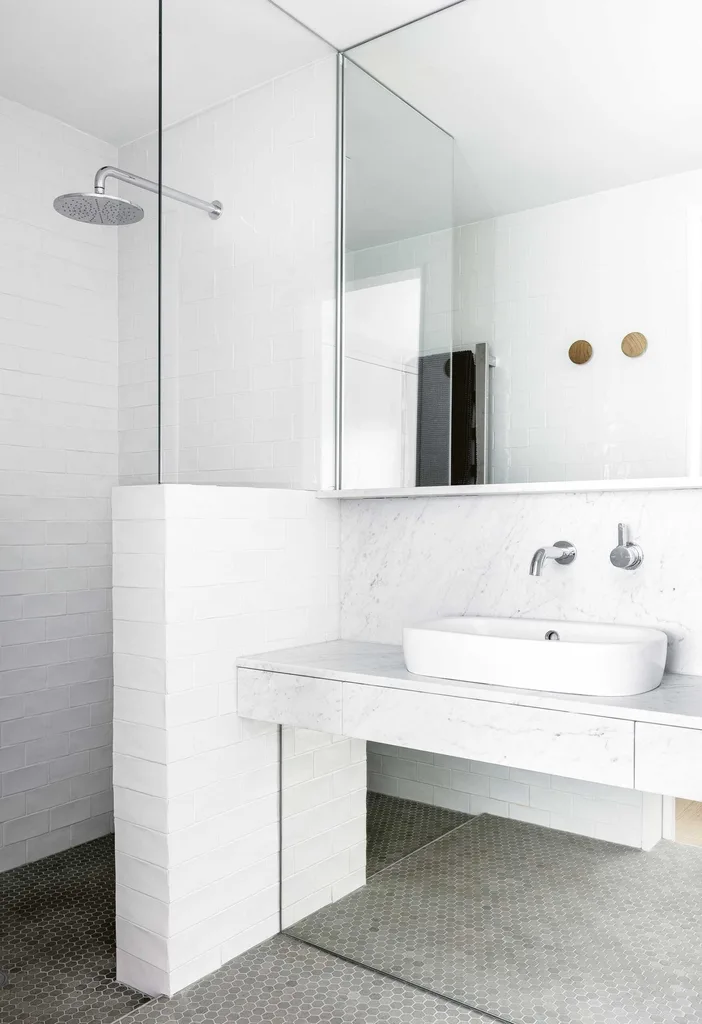 Ensuite More tricks here try to compensate for a lack of natural light. Mirrors run above and below the vanity to catch the light from the bedroom and play up the sense of space. A carrara marble splashback and vanity bring the luxe factor.