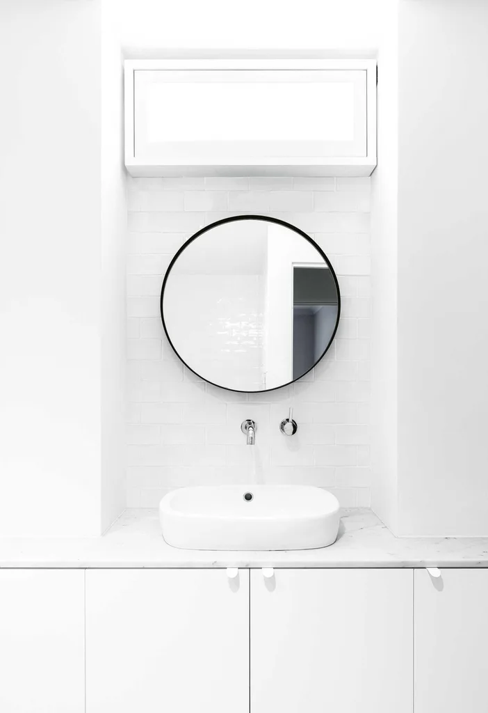 Bathroom Without natural light, the architects had to work hard to make the bathrooms shine. A faux window above the mirror works to great effect. “Often, people come out puzzled, and they sort of say, ‘where does that window go?’,” says Lesley with a laugh.