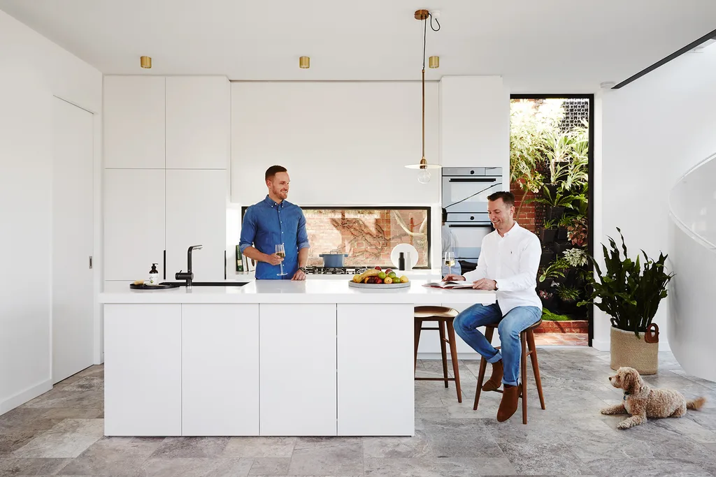 Dan (left) and Scott with their spoodle Kirby. Turkish silver travertine floor tiles (throughout).