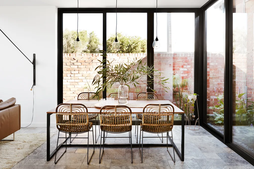 Greenery planted along the boundary wall creates the feel of a private walled garden. Scott and Dan made the dining table themselves. “It was a fun project,” says Scott. “We had the steel frame made up then constructed the top out of reclaimed timber we found at a local timber yard.” House Doctor dining chairs, from Telegram Open House.