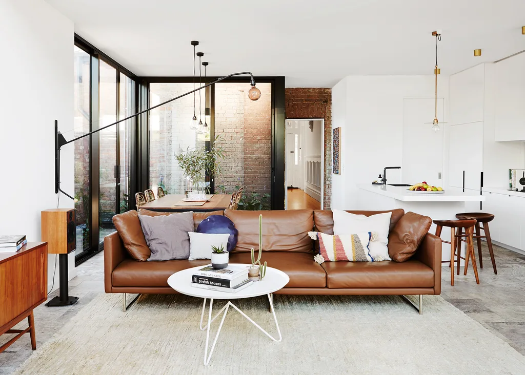 Original brick is a feature in the modern addition, ensuring the sense of history is retained throughout. Sofa bought in Korea. Coffee table and stools, from Clickon Furniture.