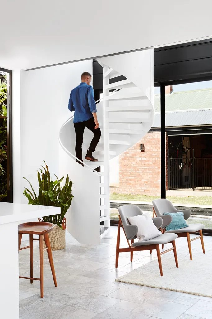 The extension is what really sets this home apart. There’s a light and airy glass-walled open-plan kitchen/dining/living zone on the ground floor, from which a sculptural spiral staircase leads to the couple’s bedroom suite. In the backyard, a shimmering new pool, sauna and lush garden beckon.