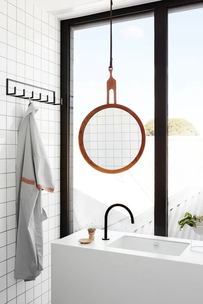 “Our ensuite is my favourite room in the house,” says Scott. Wall tiles, from Genesis Tiles. Mirror, from Organic Modernism. Corian vanity. Tapware, from Reece.